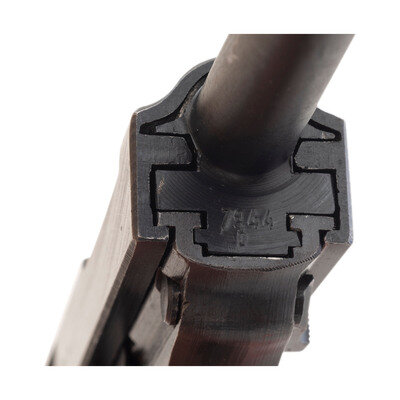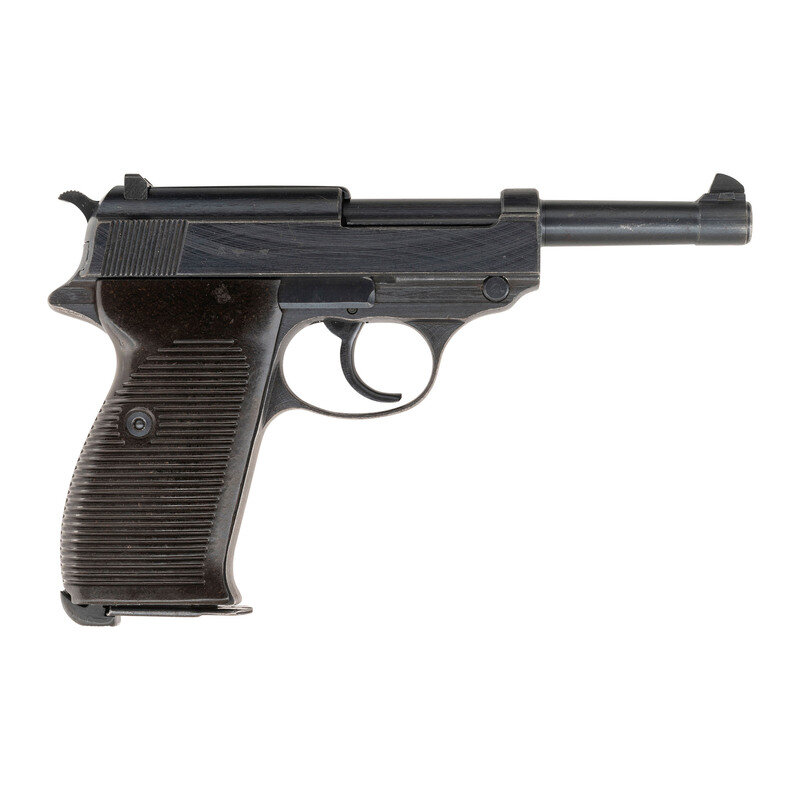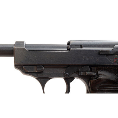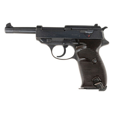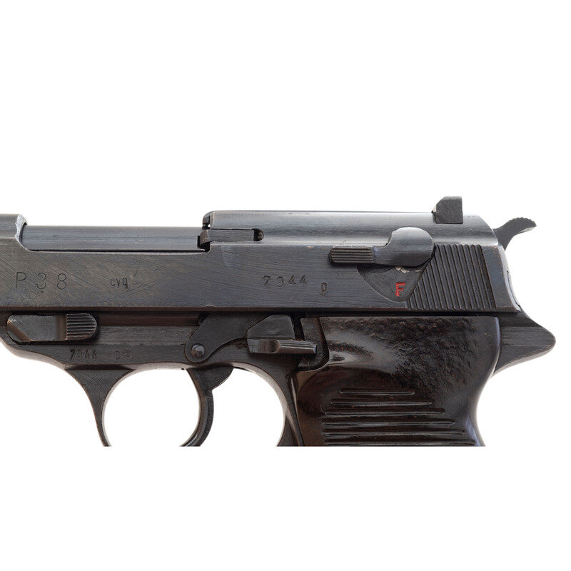 9mm Para. 4.9" barrel length. SN: 7944p. Blued metal finish overall mounting brown synthetic grips with thirty horizontal serrations per side. Short-recoil operated DA/SA autoloading pistol fed by detachable single-stack magazines and mounting standard military-pattern sights. Left slide shows model marking P.38 followed by the cyq code indicating it was made by Spreewerke. Item shows {Eagle/88} Waffenamt marks on the right slide, left frame, left barrel, and the right locking lug. Item additionally shows {WWII German Eagle} proof marks on the right slide and the left locking lug. Item shows matching serial number markings to the barrel, locking lug, frame, and slide. Grips exhibit standard mold markings to the interior surfaces. Comes with one magazine showing maker marking jvd.