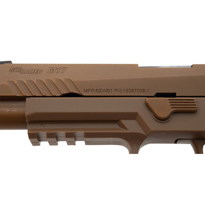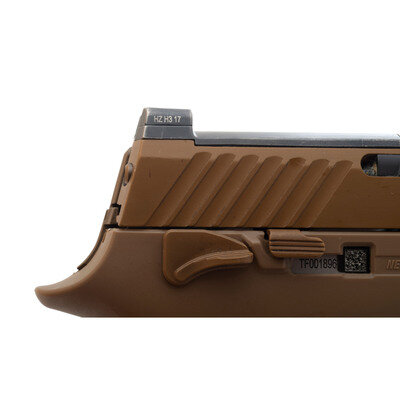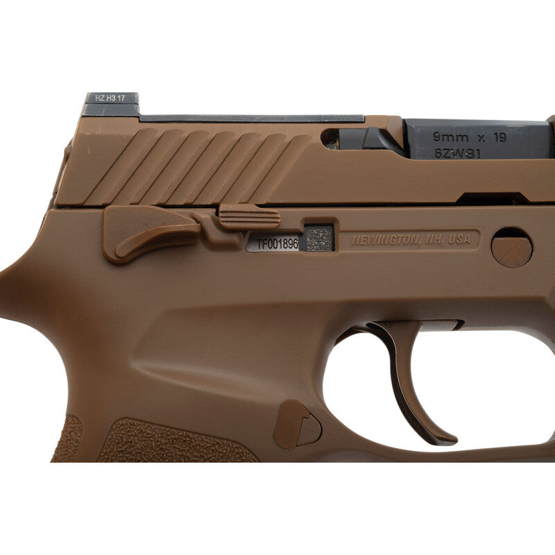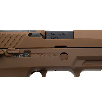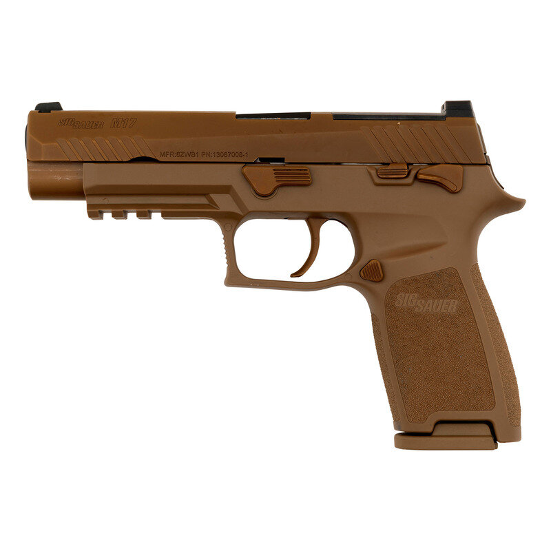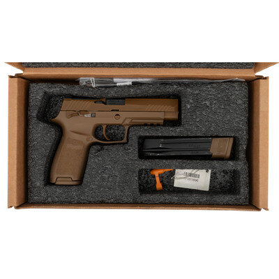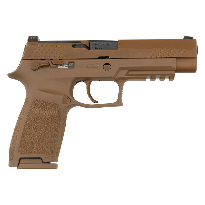 9mm Para. 4.7" barrel length. SN: TF001896. Coyote Brown PVD finish to all metal parts including the trigger and control surfaces mounting a further Coyote Brown synthetic frame with accessory rail, ambidextrous safety and slide stops. Short recoil operated striker-action autoloading pistol fed by detachable double stack magazines. Item mounts tritium night sights on a black Nitride finished plate. Left slide is struck SIG SAUER M17 above the forward cocking serrations with further marks behind the serrations reading MFR:6ZWB1 PN:13067008-1. Frame displays SIG SAUER molding into the grip texturing with the address NEWINGTON, NH, USA on the right frame forward of the serial number and QR code plate. Fire Control Unit shows a U.S. 9MM M17 marking just to the left of the serial number. Comes in a number matching Sig Sauer issued cardboard box marked SURPLUS with one 17-shot and one 21-shot magazine, cable lock in package, and a spare recoil spring. The serial number, coupled with the brown colored controls and tamper-resistant screws indicates this to be one of the first handguns manufactured for evaluation by units of the United States Military. After the handguns were returned for inspection, Sig-Sauer issued approximately 3500 to dealers for commercial sale. This handgun represents one of the first of its kind to actually pass through the hands of American military personnel.