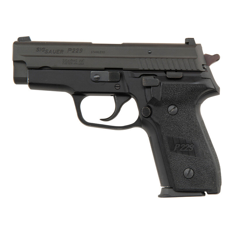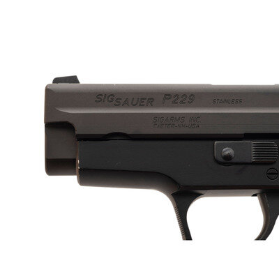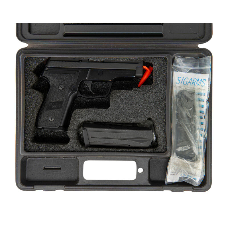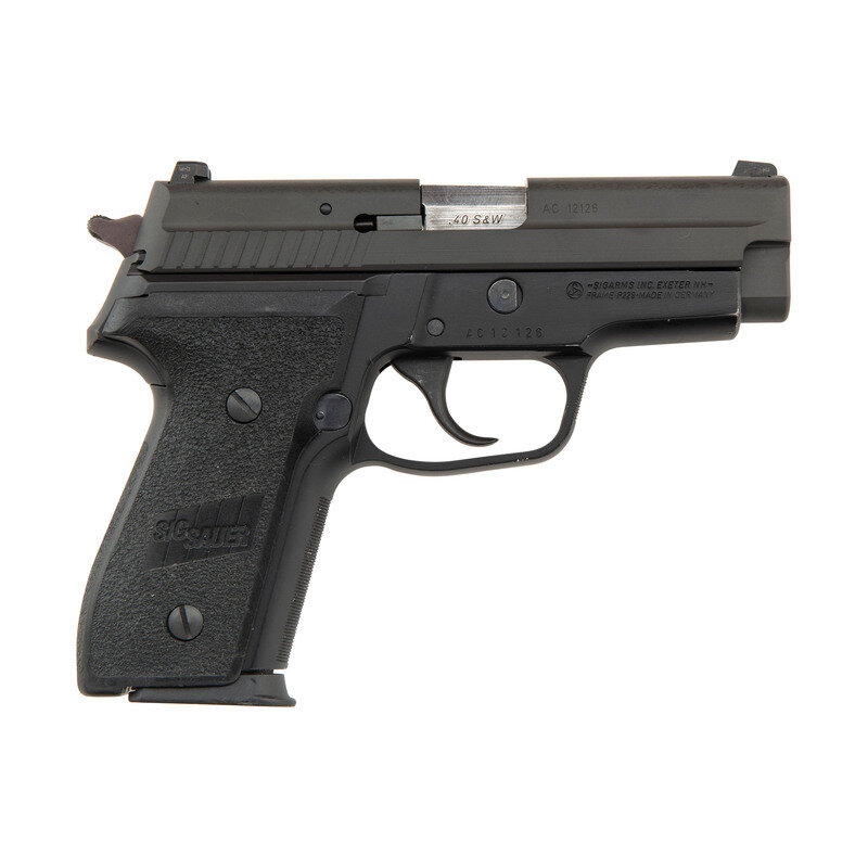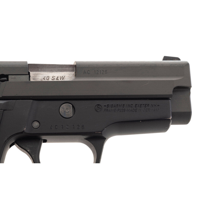 .40 S&W/.357 Sig. 3.8" barrel length. SN: AC12126. Parkerized metal finish with black anodized alloy frame mounting two piece SIG SAUER logo grips and tritium night sights. Short recoil operated DA/SA autoloading pistol fed by detachable double stack magazines. Item shows standard make and model markings including -SIGARMS INC. EXETER NH-/FRAME-P229-MADE IN GERMANY to the right frame. Comes in a gray synthetic hard case with two .40/.357 Sig magazines, .357 Sig barrel, spare recoil spring, spare set of night sights, and one P229 9mm magazine.