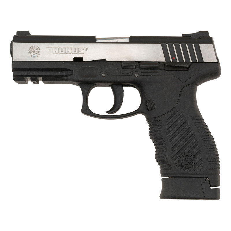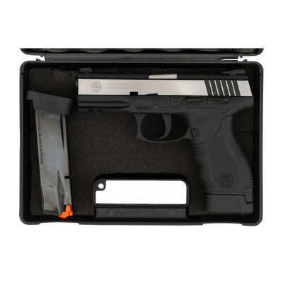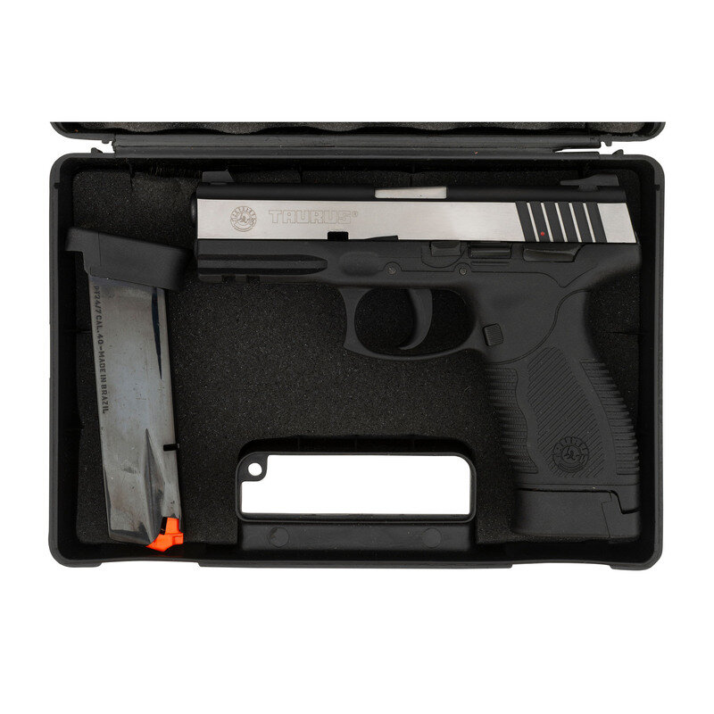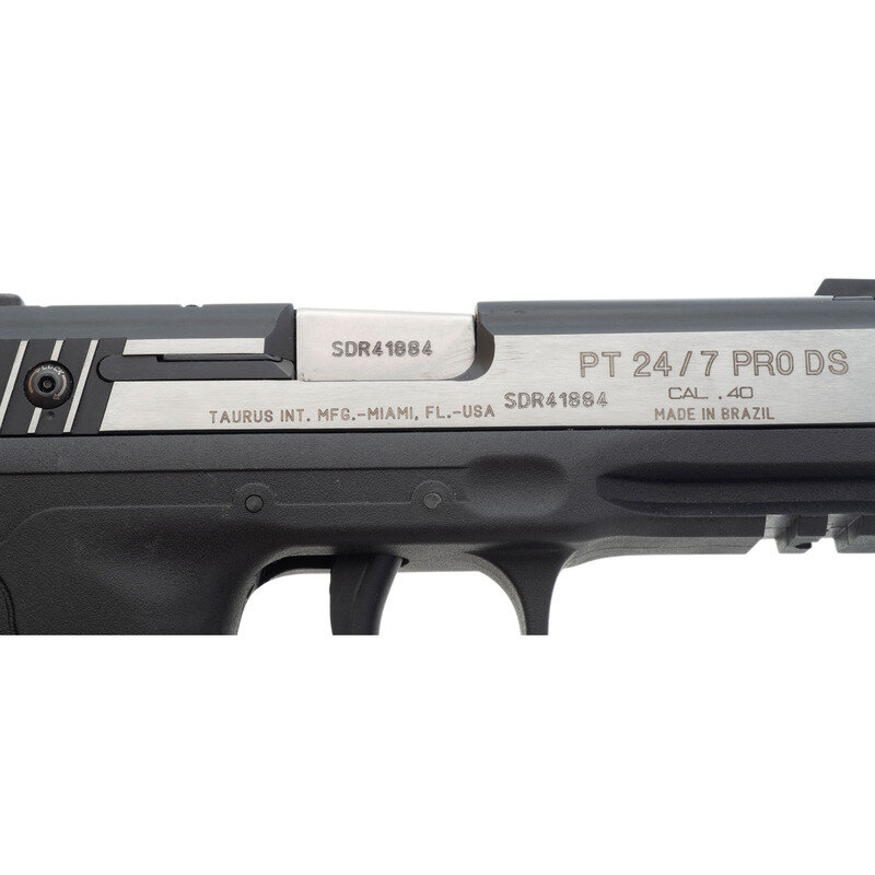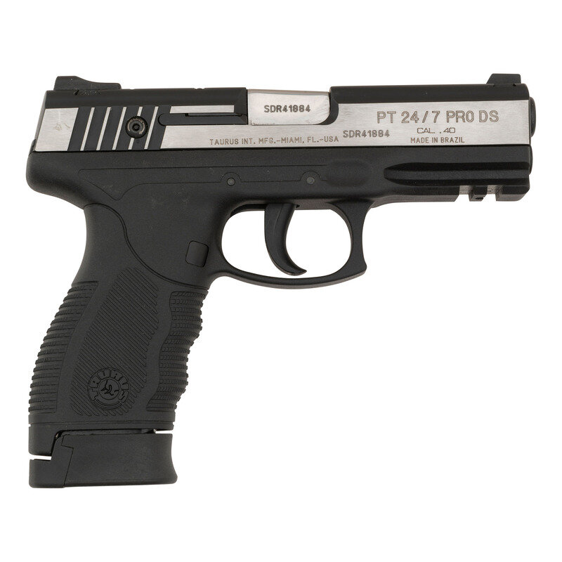 .40 S&W. 4.2" barrel length. SN: SDR41884. Black Nitride finish with polished slide flanks set in a black synthetic frame with frame mounted accessory rail, and matted triple white dot sights. Short-recoil operated striker-action autoloading pistol fed by detachable double stack magazines. Item features an internal safety locking system on the right slide. Markings include PT 24/7 PRO DS/CAL .40/MADE IN BRAZIL on the right slide, along with maker marking TAURUS INT. MFG.-MIAMI, FL.-USA. Comes in a black synthetic Taurus marked case with two magazines, two internal safety lock keys, and the owner's manual.