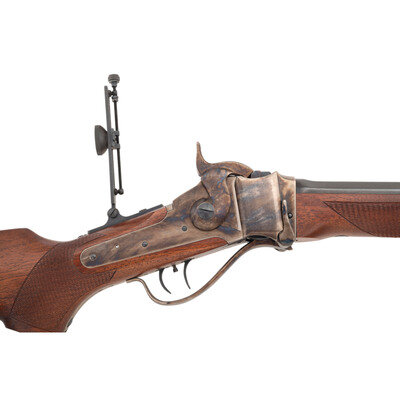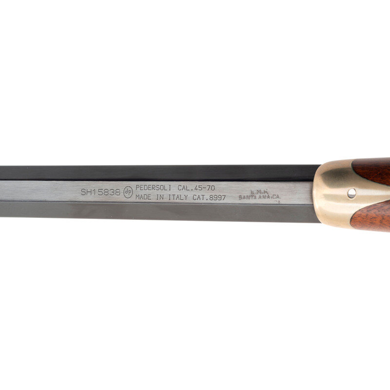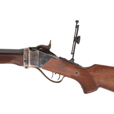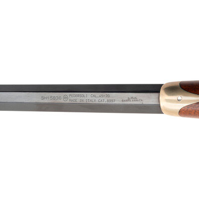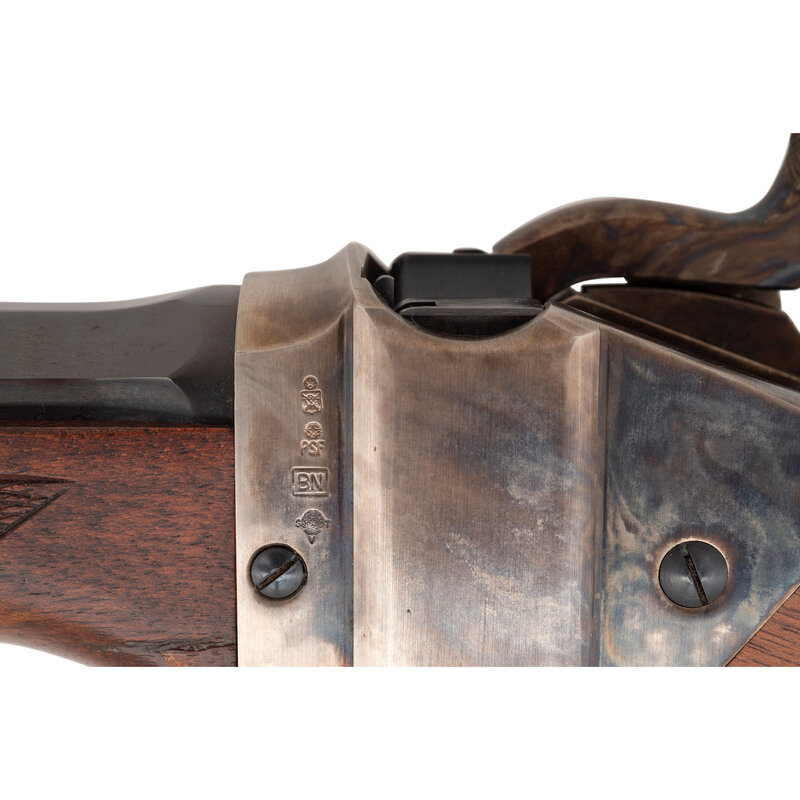 .45-70 GOVT. 32" octagonal barrel. SN: SH15838. Blued metal finish to barrel and parts, with case hardened finish to frame and buttplate. Two piece walnut stock has checkering to semi pistol grip and splinter-style forearm, with silver forend cap. Single shot falling block rifle with tang mounted adjustable ladder peep sight, adjustable folding ladder notch rear sight, hooded post front sight, and double set triggers.