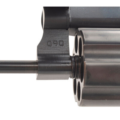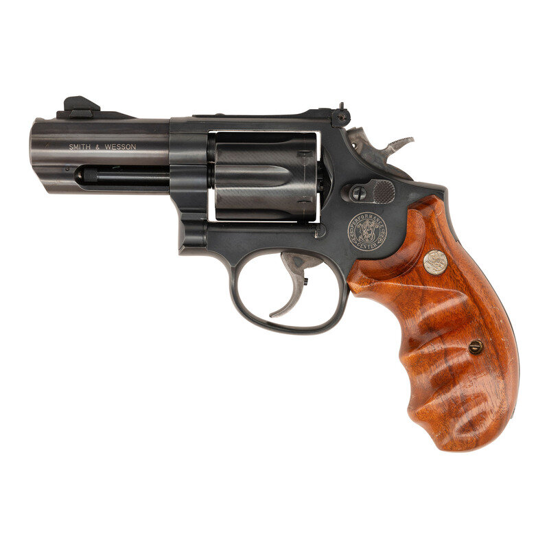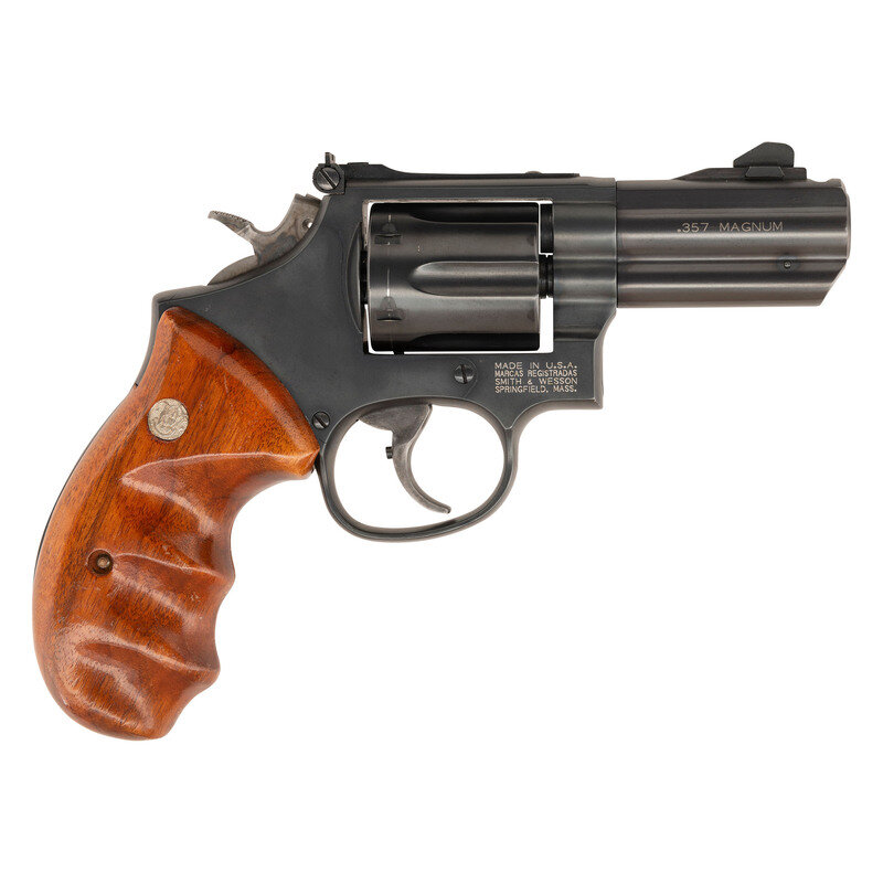 .357 Magnum. 3" barrel length. SN: SDA0910. Matte blued metal finish overall with color case hardened hammer and trigger mounting Smith & Wesson medallion walnut grips. Double action six-shot hand ejector revolver with ported muzzle. Item mounts adjustable rear notch and tritium front blade sights. Standard make and model markings appear overall including Smith & Wesson's PERFORMANCE/CENTER seal to the left frame and four-line address mark to the right. Barrel flanks show the standard make and caliber markings. Item manufactured without the internal security lock system.