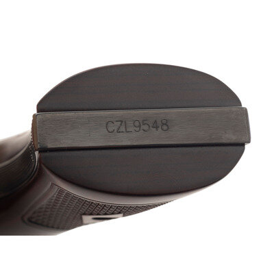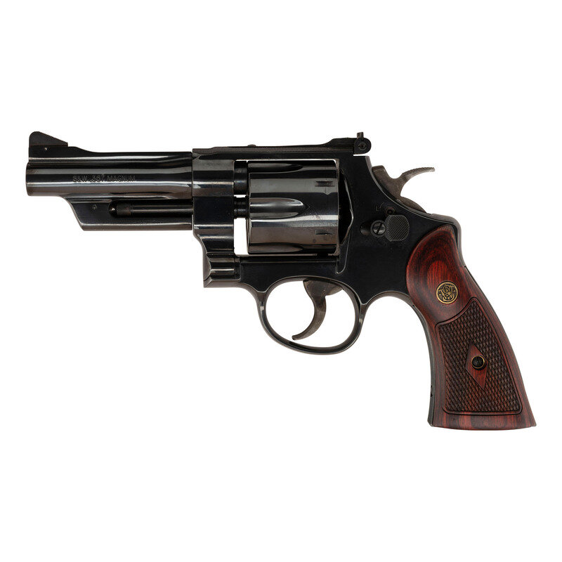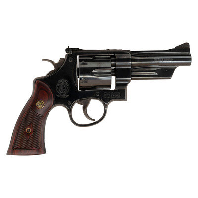 .357 Magnum. 4" ribbed barrel. SN: CZL9548. Blued finish, color casehardened trigger and hammer, checkered S&W medallion hardwood grips. Double action revolver with adjustable rear sight, pinned serrated ramp front sight, grooved wide trigger face, checkered wide hammer spur, swing-out six-chambered fluted cylinder and partial underlug. Revolver is contained in the original factory plastic box with paperwork.