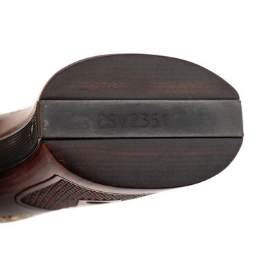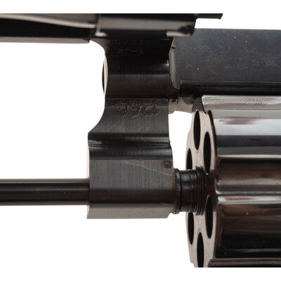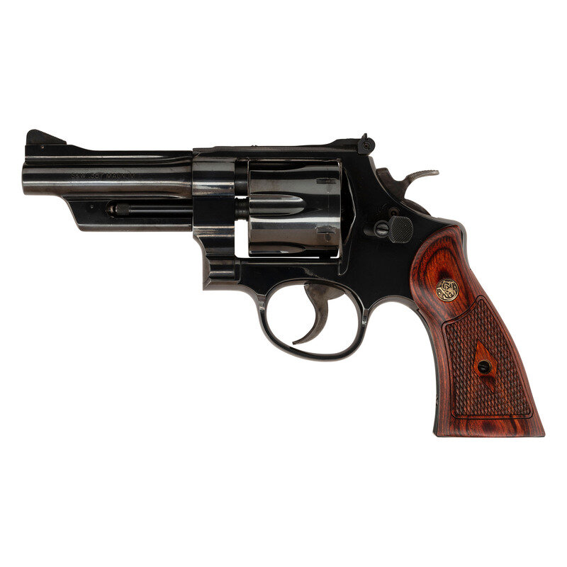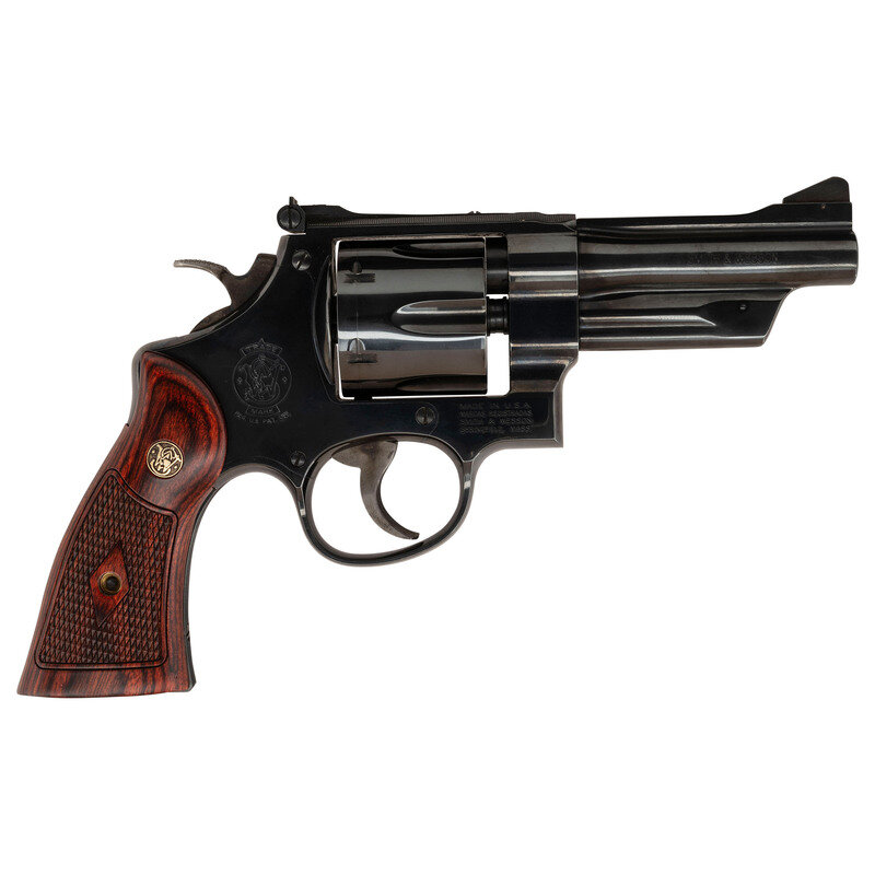.357 Magnum. 4" ribbed barrel. SN: CSV2351. Blued finish, color casehardened trigger and hammer, checkered S&W medallion hardwood grips. Double action revolver with adjustable rear sight, pinned serrated ramp front sight, grooved wide trigger face, checkered wide hammer spur, swing-out six-chambered fluted cylinder and partial underlug. Revolver is contained in the original factory plastic box with paperwork.