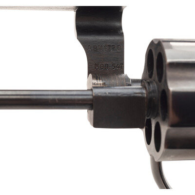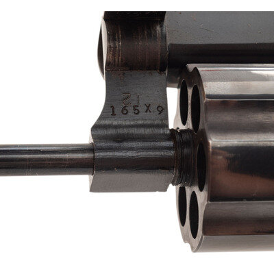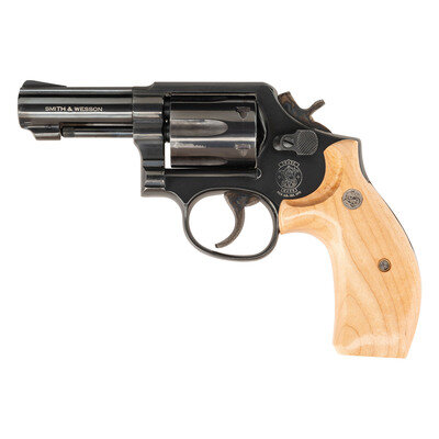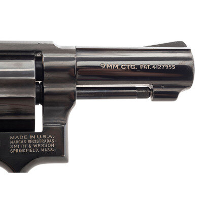 9mm Para. 3" barrel length. SN: ABN6720. Blued metal finish with color case hardened hammer and trigger mounting polished wood Smith & Wesson medallion grips. Double-action hand ejector six-shot revolver mounting topstrap notch and matted front ramp sights. Markings include Smith & Wesson monogram trade mark to the left frame and four-line address to right. Standard maker and caliber marks appear on the flanks of the barrel.