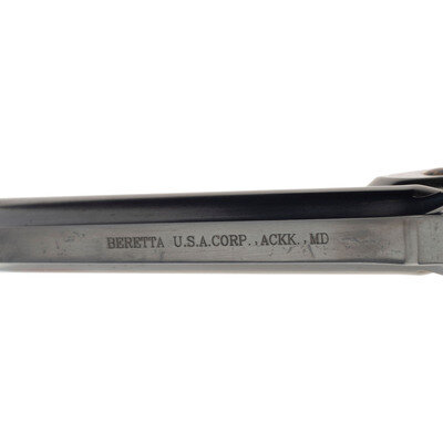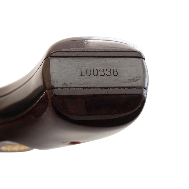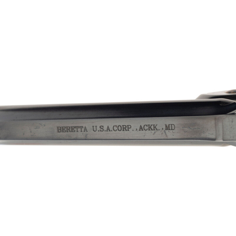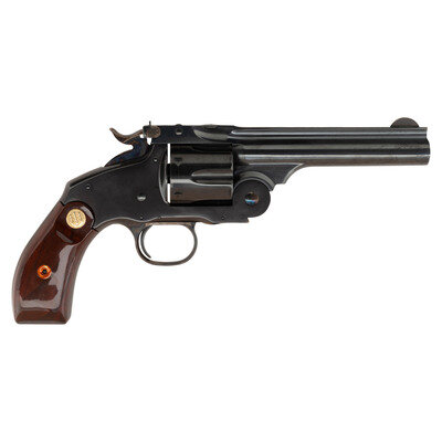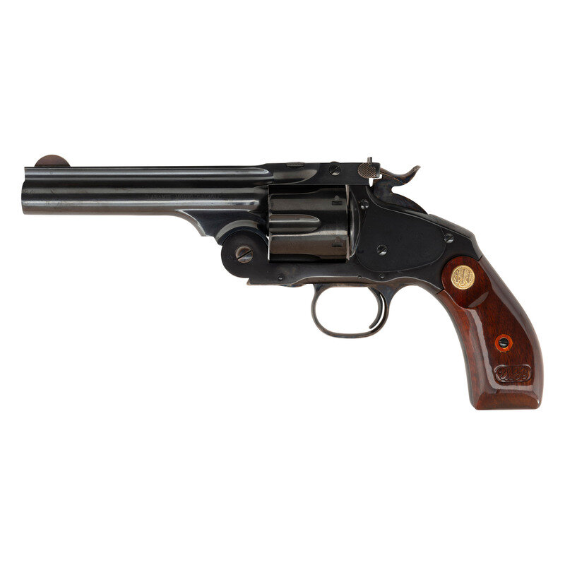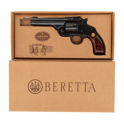 .45 Colt. 5" ribbed barrel. SN: L00338. Blued finish, color casehardened triggerguard and hammer, varnished hardwood Beretta medallion grips. An interesting "replica" of the single action break top S&W Schofield using a New Model No 3 type "hump backed" frame and grip styling, top strap with knurled knob cylinder release and the lift up barrel catch with integral rear sight. The front sight is half-moon pinned sight and the cylinder is six-chambered and fluted. The varnished grips have a "replica" cartouche on the right side. The revolver includes its factory cardboard box and paperwork.