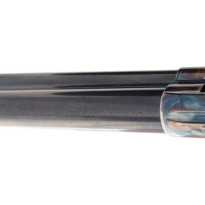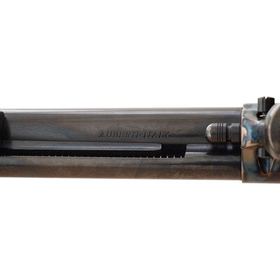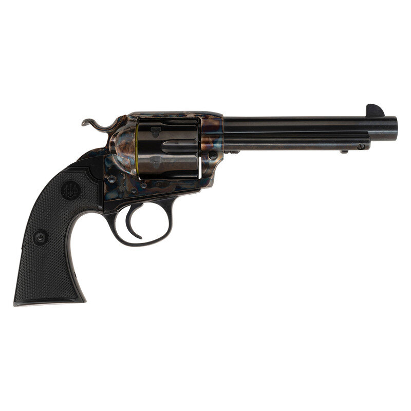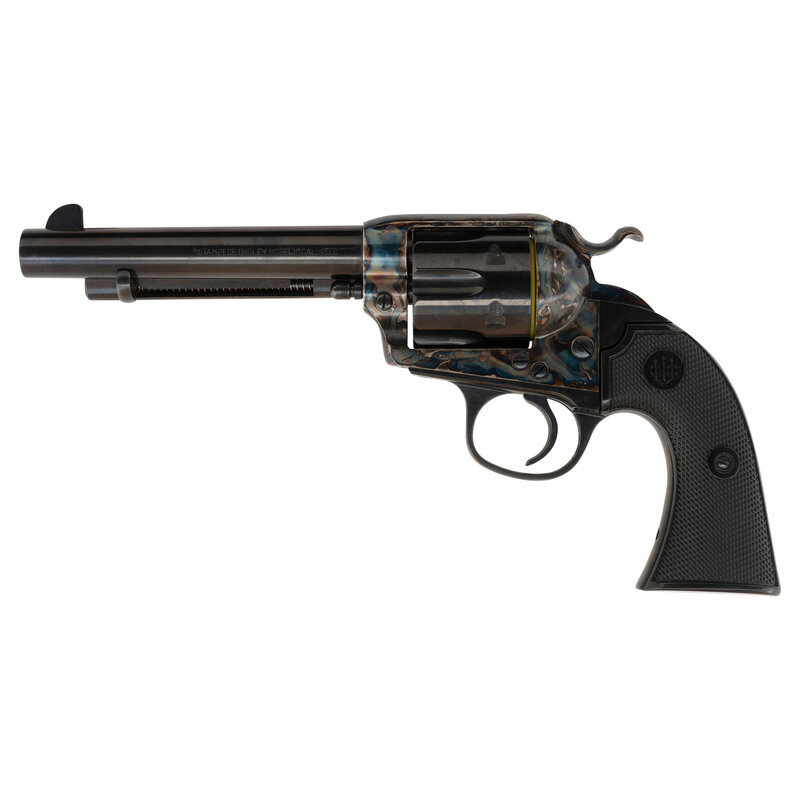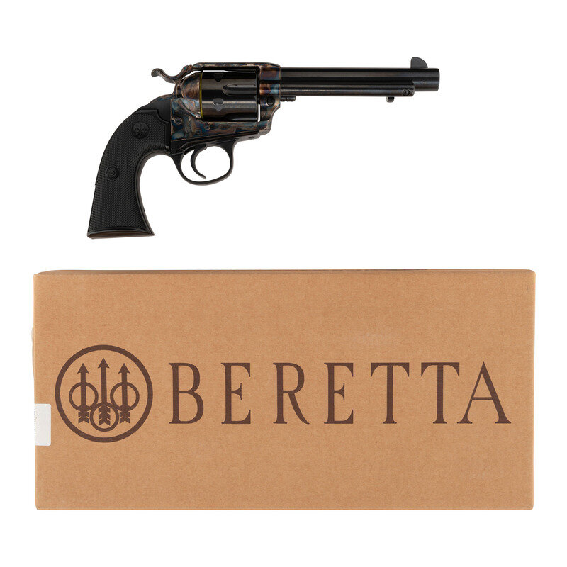 .45 Long Colt. 5.5" barrel. SN: B19703. Blued and color casehardened finish, checkered Beretta logo two-piece plastic grips. Replica Colt Bisley single action revolver with "smokeless powder" frame, kidney shaped ejector rod head, low hammer spur, exaggerated Bisley grip frame, frame notch rear sight, blade front sight and six-chambered fluted cylinder. Includes factory cardboard box and paperwork.