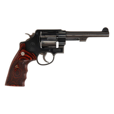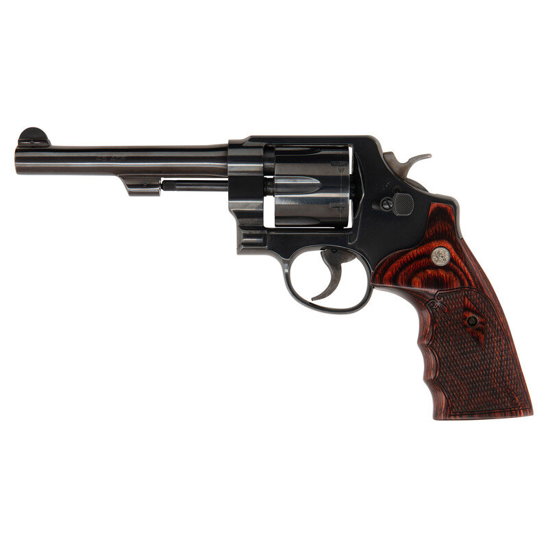 .45 ACP. 5.5" barrel. SN: DBD2062. Blued finish, color casehardened hammer and trigger, oversized S&W logo checkered finger-groove hardwood grips. Double action revolver with frame notch rear sight, half-moon front sight blade, checkered wide hammer spur, wide smooth trigger face and 6-chambered fluted swing out cylinder.
