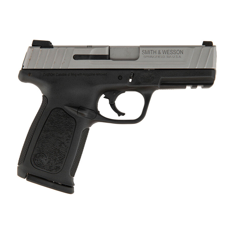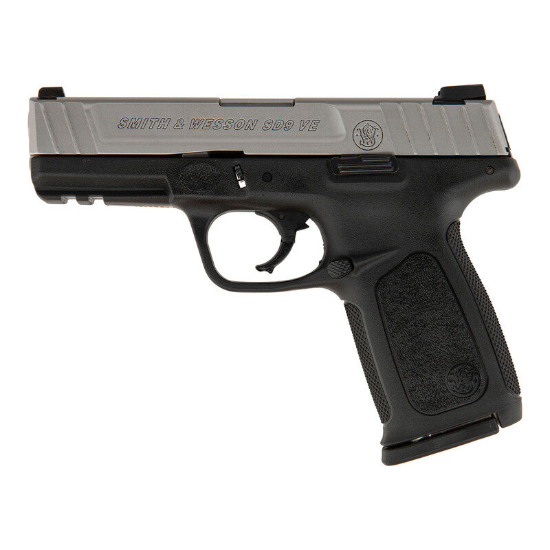 9mm Para. 4" barrel length. SN: FBB9791. Matte stainless steel finish with black synthetic frame mounting factory triple white dot sights. Short-recoil operated striker action autoloading pistol fed by detachable double stack magazines. Standard markings include SMITH & WESSON SD9 VE to the left slide with two-line address on the right. Item features a frame mounted accessory rail and knurled texturing to the gripstraps. Comes in a matching Smith & Wesson marked cardboard box with the owner's manual, two magazines, and a cable lock in package.