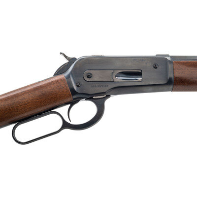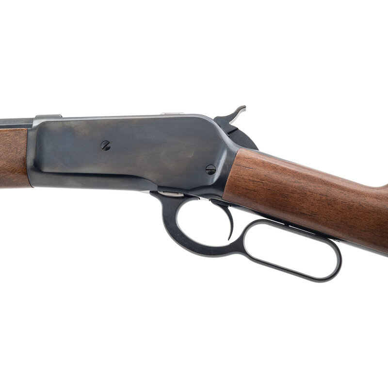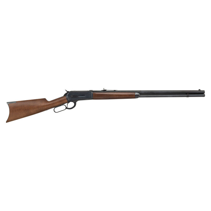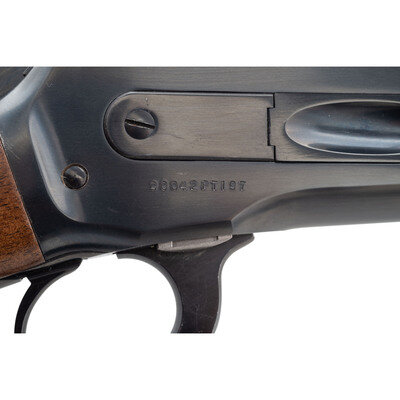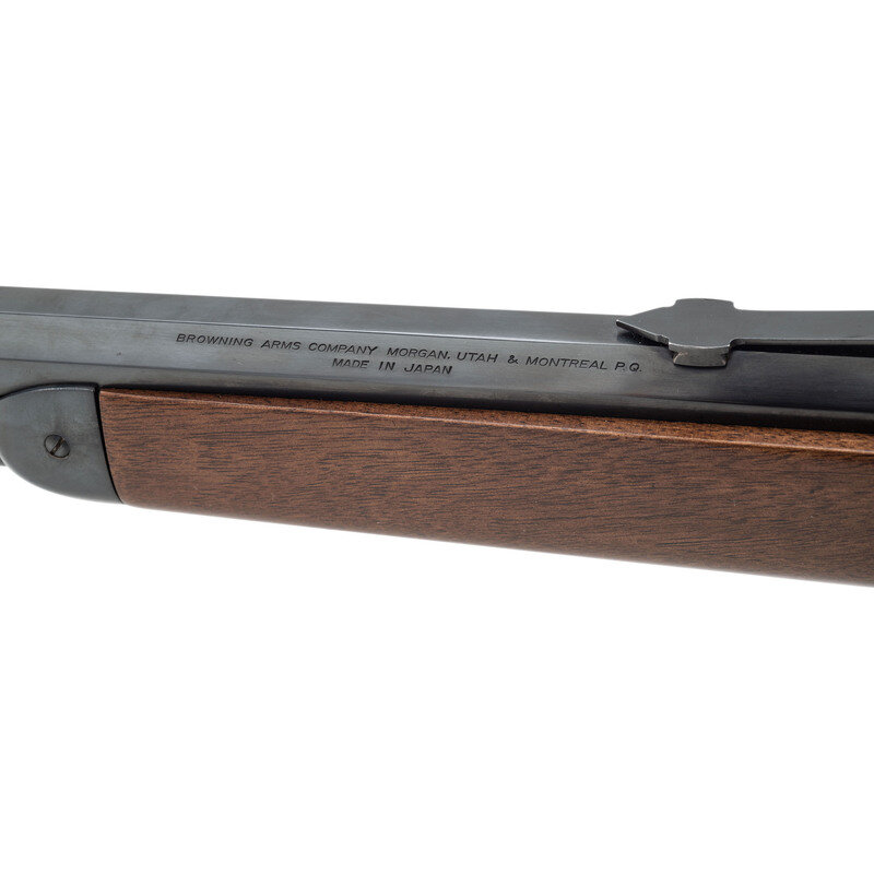 .45-70 Government. 26" octagonal barrel. SN: 90042PT197. Blued metal finish. Two piece walnut stock has a plain straight grip and forearm. Lever action rifle with an adjustable semi buckhorn rear sight, blade front sight, and full tube magazine. Made in Japan.