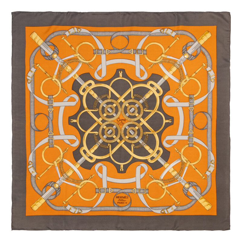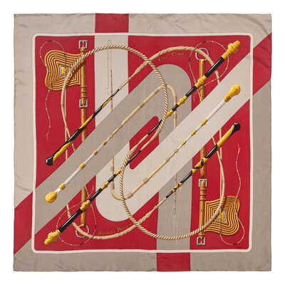 "Éperon d'Or" Scarf 90 in printed silk twill. Features rolled and hand-stitched edges.