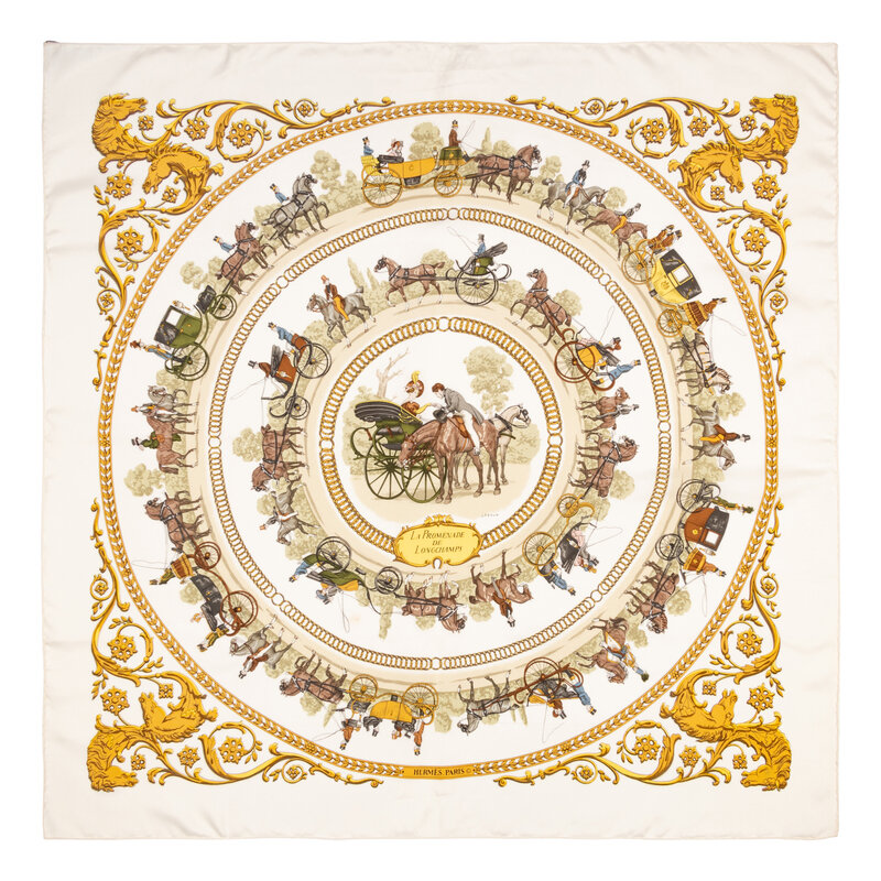 "La Promenade de Longchamps" Scarf 90 in printed silk twill. Features rolled and hand-stitched edges.