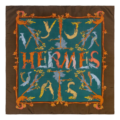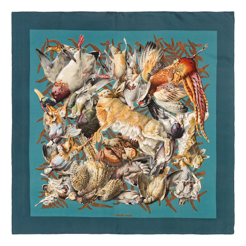 "Gibiers" Scarf 90 in printed silk twill. Features rolled and hand-stitched edges.