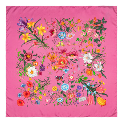Square scarf in printed silk charmeuse. Hand rolled edges.
