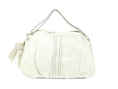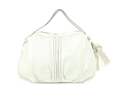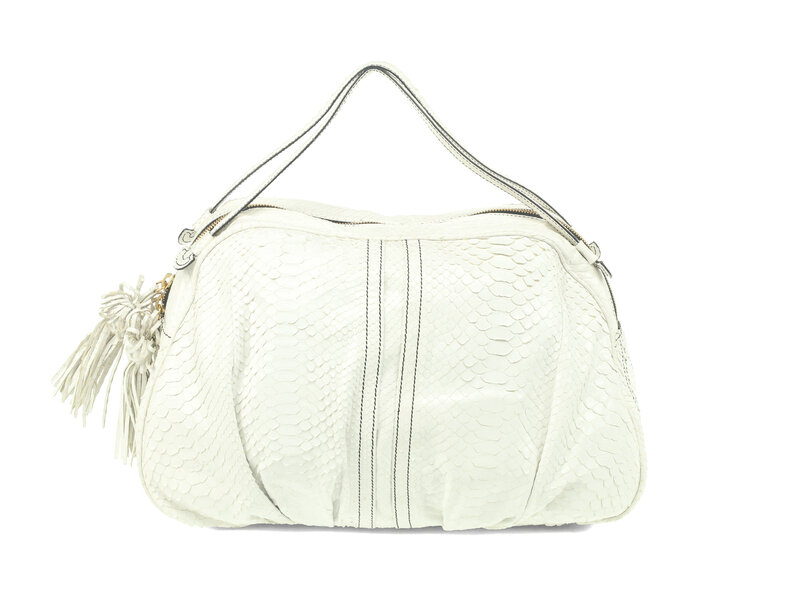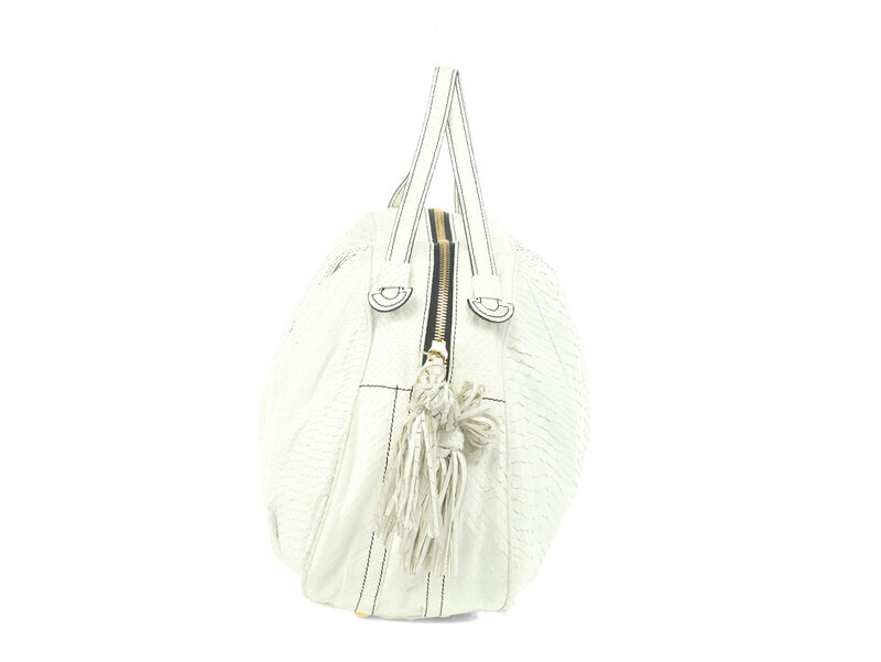 Tote in white python with gold-tone hardware. Top handles & snakeskin tassels on zipper pulls.