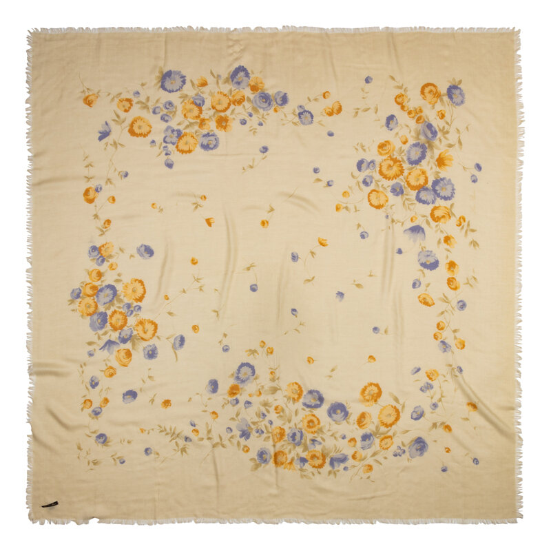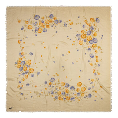 Beige cashmere-silk/blend twill scarf with all-over mulitcolor floral print and raw fringed edges.