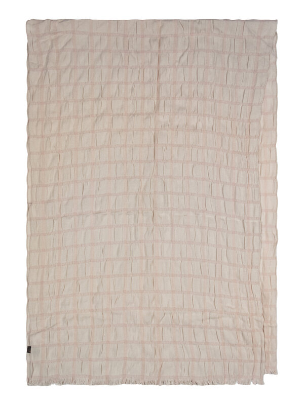 Light pink silk/cashmere-blend textured jacquard scarf with stitched and raw fringed edges.