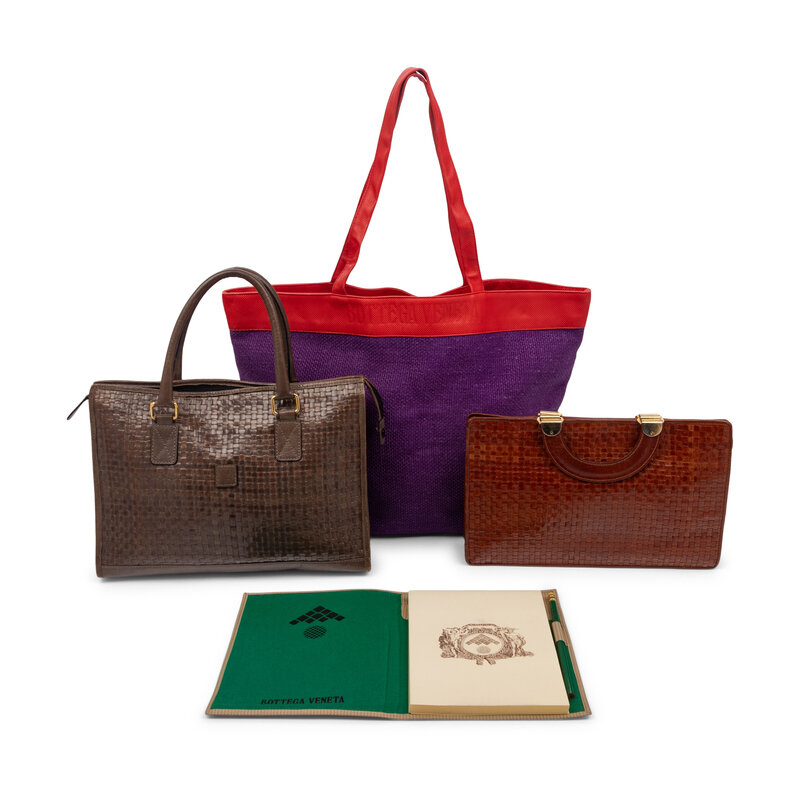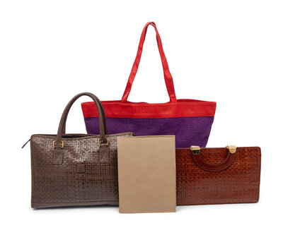 Handbag in Brown Leather with Woven Panels with Gold-Tone Hardware.