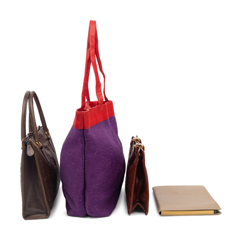 Tote Bag in Purple Burlap and Red Embossed Leather.