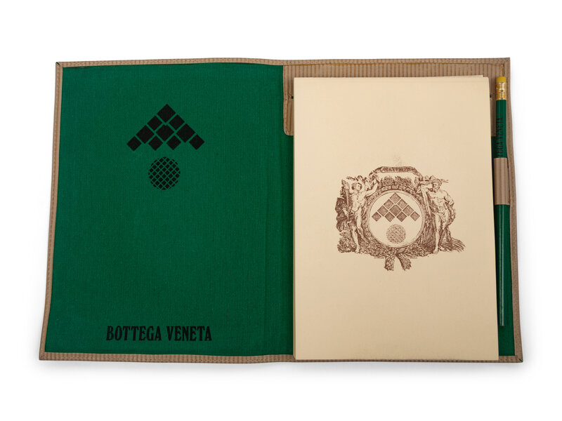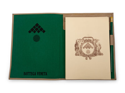 Additional Information: Green cotton lining with printed logo and insignia, branded paper notepad with lined pages