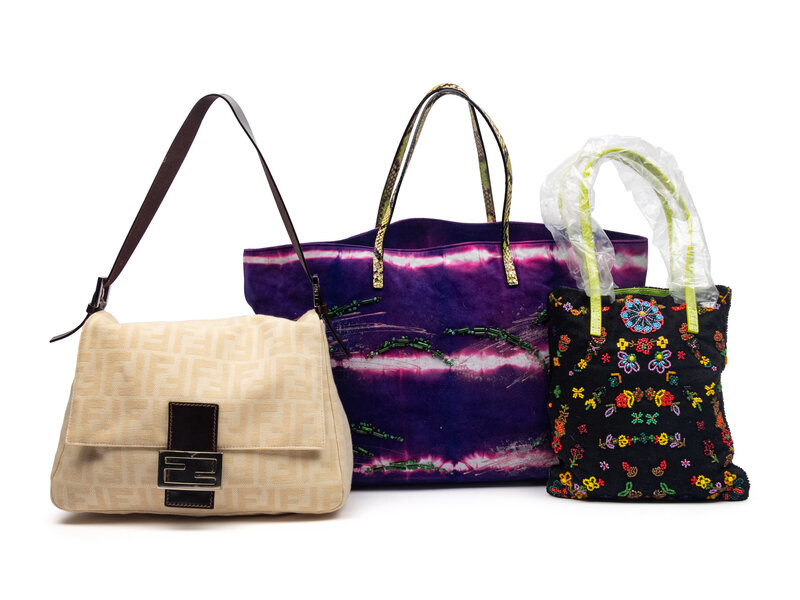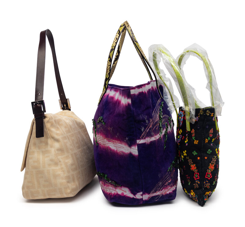 Tote Bag in Tie-Dyed Purple Suede with Green Bead Embellishments and Multicolor Snakeskin Accents.