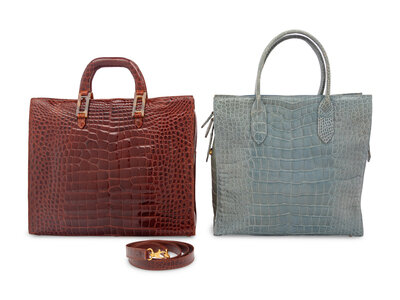 Additional Information: Gold-tone hardware; zipper closure; extended zipper with magnetic snaps at sides; three main interior compartments, central with zipper closure; light blue leather lining; interior sidewall zipper pocket, interior sidewall slip pocket; metal protective feet at base.