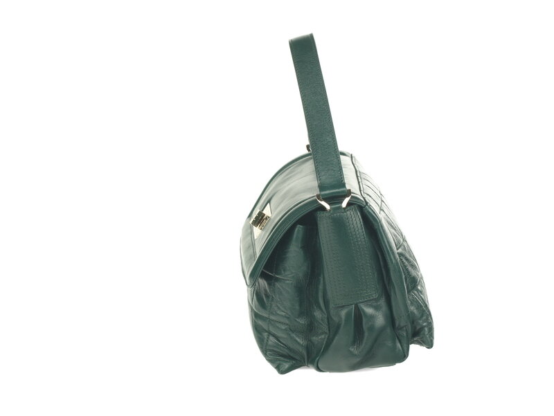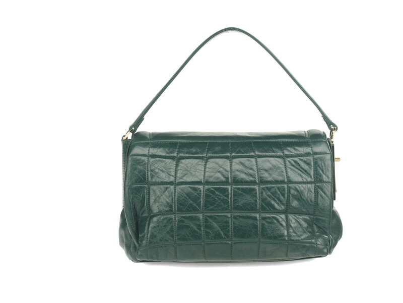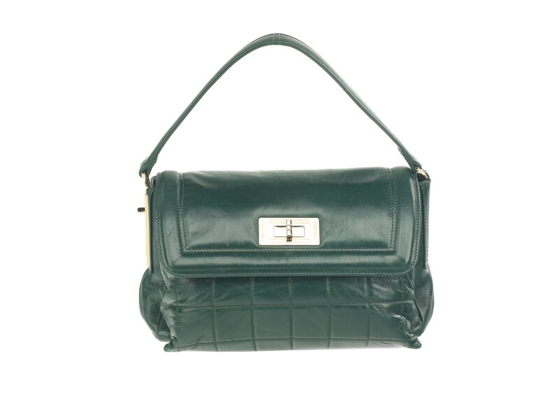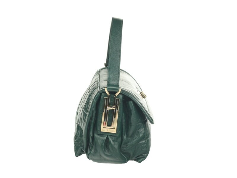 Chanel Vintage Square Quilted handbag in quilted dark green aged lambskin with light gold-tone hardware. Mademoiselle turn-lock closure and flat leather shoulder strap with metal Mademoiselle turn-lock strap extender at side.