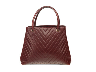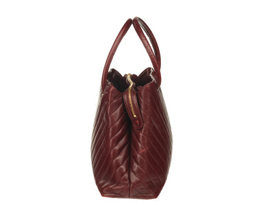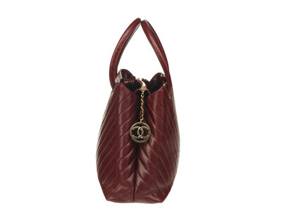 Chanel Medallion Chevron Tote Bag in quilted maroon lambskin leather with gold-tone hardware. Zipper closure and corded leather straps. Metal CC medallion attached to zipper pull.