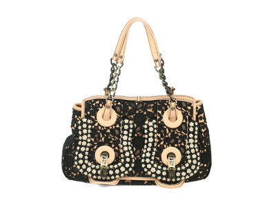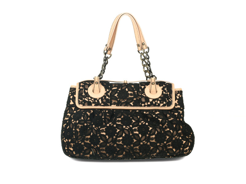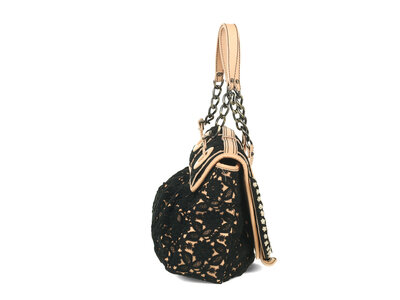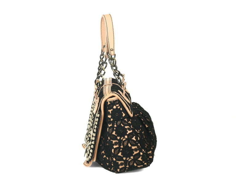 B Bag in baby pink leather and black lace overlay with beaded accents and aged brass-tone hardware.