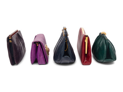 Additional Information: Gold-tone hardware, pull clasp closure, purple satin lining, interior sidewall slip pocket, interior sidewall zipper pocket.