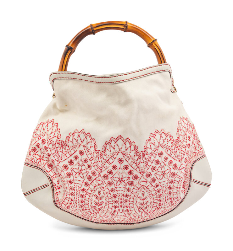 Embroidered Hobo Bag in white canvas with red embroidery and white leather. Bamboo handle and light gold-tone hardware.