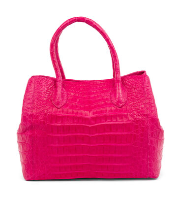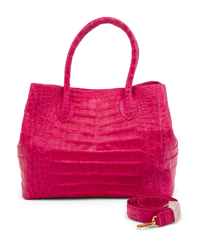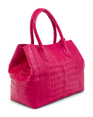 Tote bag in hot pink crocodile skin with removable shoulder strap.