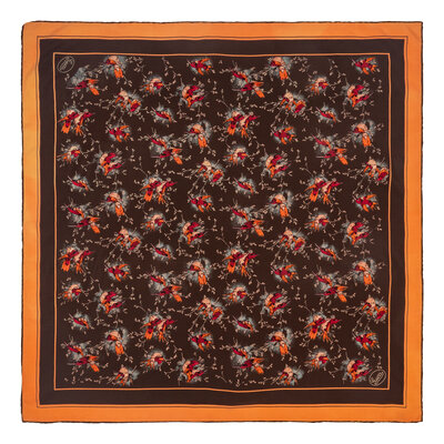 Square scarf in multicolor printed silk charmeuse with bird motifs. Hand rolled edges.