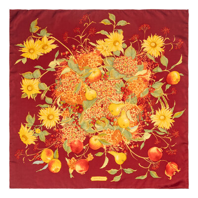 Square scarf in multicolor printed silk twill. Hand rolled edges.