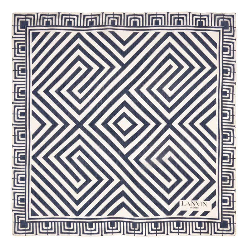 Square scarf in navy and white printed silk chiffon. Hand rolled edges.