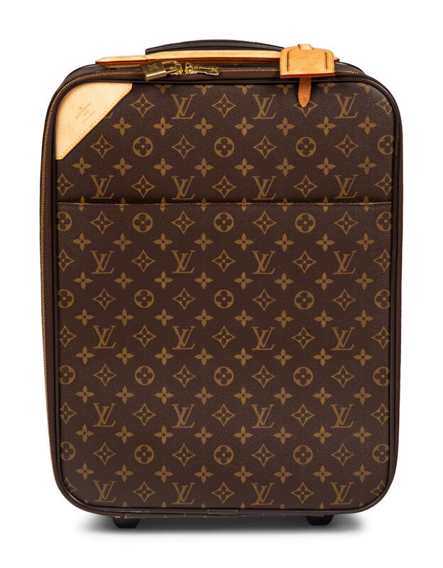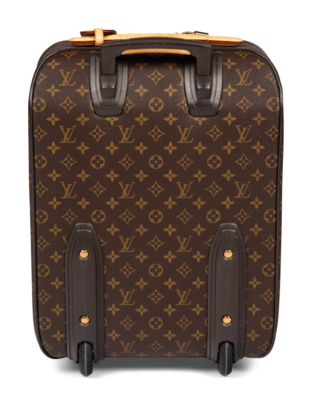Louis Vuitton Pégase 50 Rolling suit case in Monogram canvas, trimmed in Vachetta leather, gold-tone hardware, and rubber wheels with retractable metal handle.