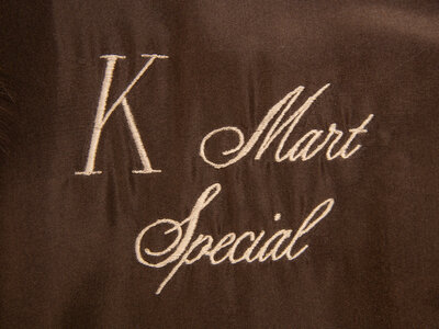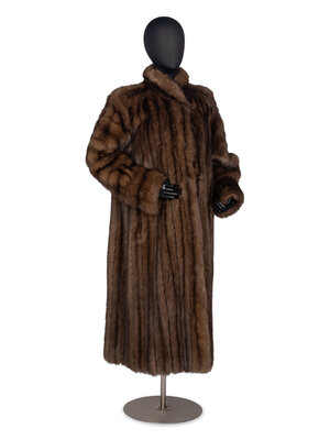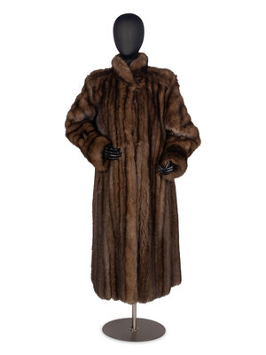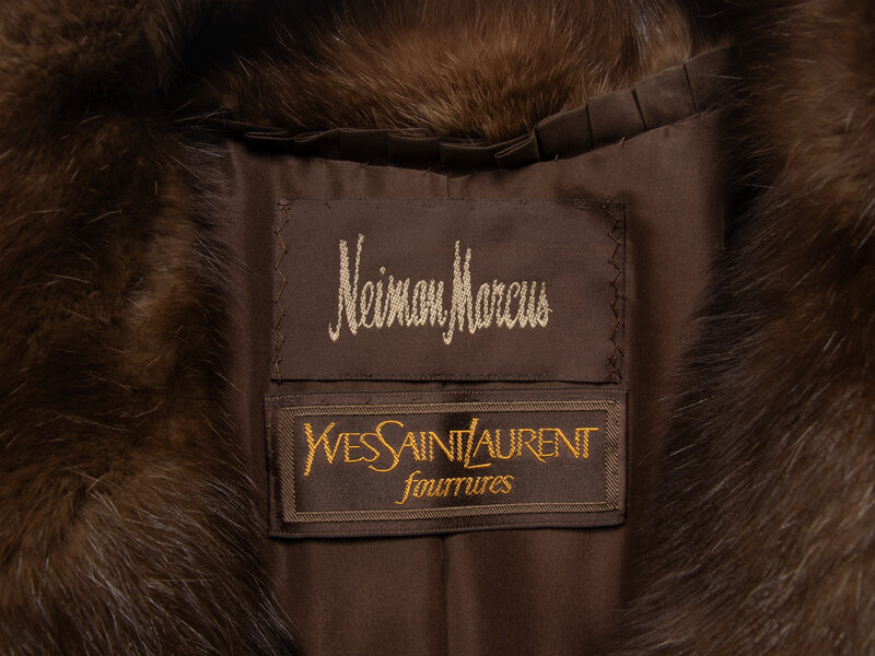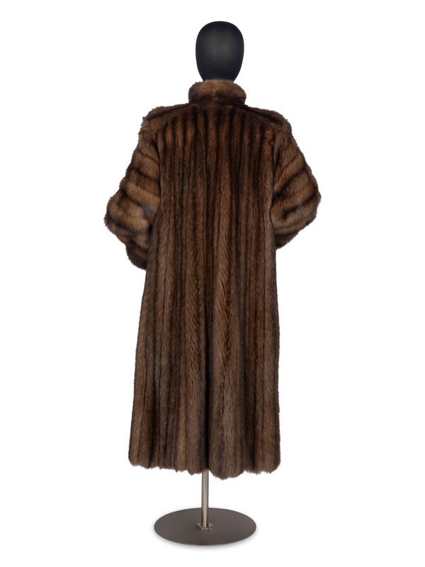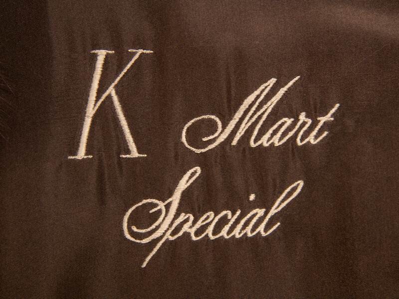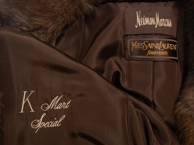 Full length sable fur coat. Shawl/stand collar, full length sleeves. Two slit pockets at jacket front. Light shoulder padding. Two hook-and-eye closures at jacket front: one at high waist, and one at neckline. Features "K Mart Special" embroidery/monogram at jacket interior.