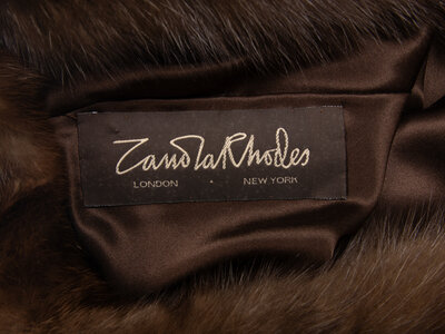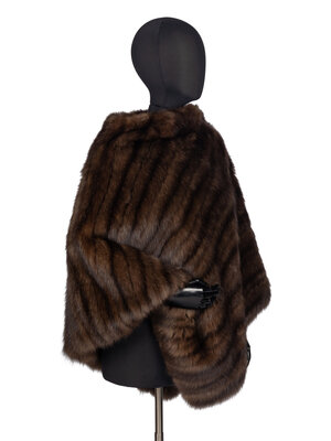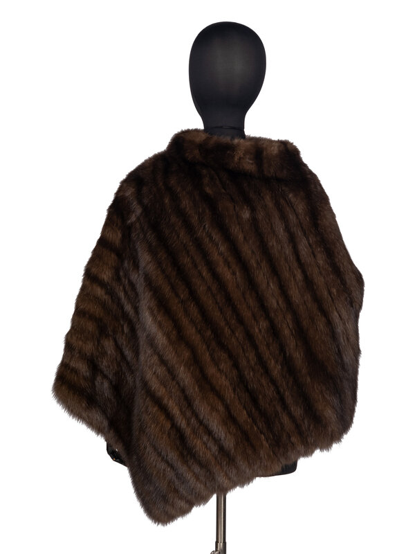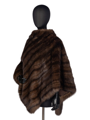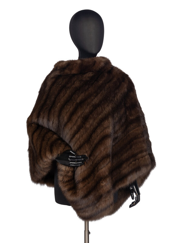 Fur poncho in brown sable. Stand collar. Square hem with points at center front and back. Fully lined. Features "Cape Town races do-da" embroidery/monogram at interior lining.