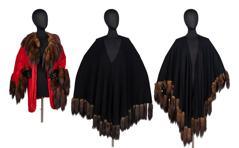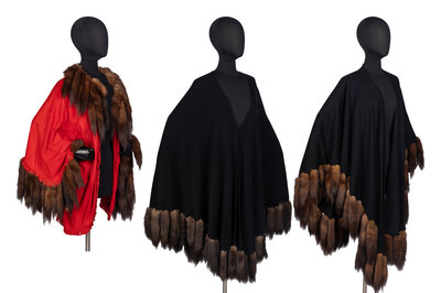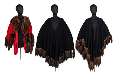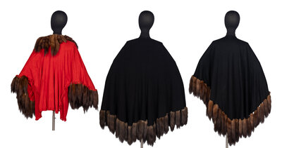 Cape in knit black cashmere with sable tail trim. Single hook-and-eye closure at front. Unlined.