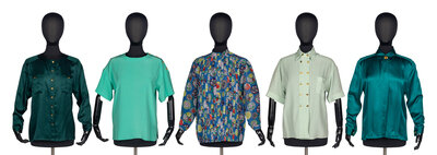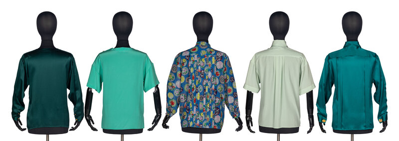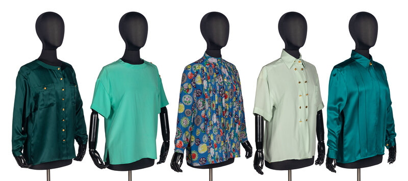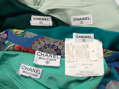 Blouse in emerald green silk charmeuse. Pointed collar. Full length sleeves with buttoned shirt cuffs; gold-tone metal CC cufflinks. Box pleats at blouse front and back. Concealed button closure at front; large gold-tone metal CC button at neck. Unlined.