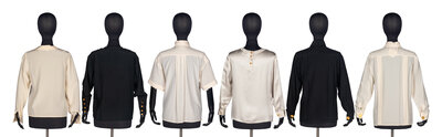 Short sleeve blouse in cream silk georgette. Pointed collar. Patch pocket at chest. Quilting details at collar, sleeve cuffs, and top of patch pocket. Box pleats at center back. Double breasted button closure with gold-tone metal buttons; twelve buttons total. Unlined.
