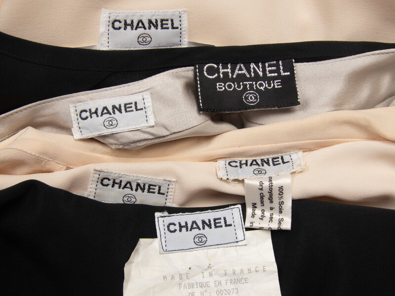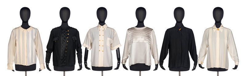 Blouse in cream silk georgette. Pointed collar. Full length sleeves with buttoned shirt cuffs; gold-tone metal CC cufflinks. Box pleats at blouse front and back. Concealed button closure at front; large gold-tone metal CC button at neck. Unlined.