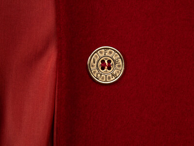 Overcoat in crimson felted wool blend. Slight A-line silhouette. Midi length; full length sleeves. Rounded convertible collar. Slight shoulder padding. Two welt pockets at front. Gold-tone metal Fendi-branded button closures at front. Fully lined.