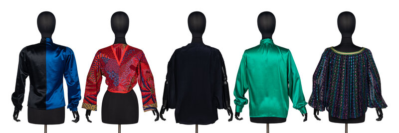 Bicolor blouse royal blue and black silk charmeuse. Mandarin collar; buttoned panels at front shoulders. Full length sleeves with buttoned cuffs; box pleats at shoulder heads. Shoulder pads. Pleats at blouse front. Rhinestone button closures at front. Unlined.