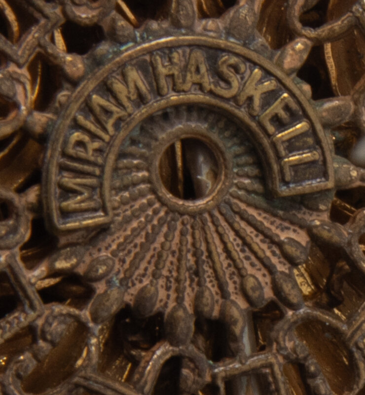 Flower-shaped brooch in gold-tone metal with all-over rhinestone and faux-pearl bead embellishments. Large faux pearl at center. Standard pin backing.