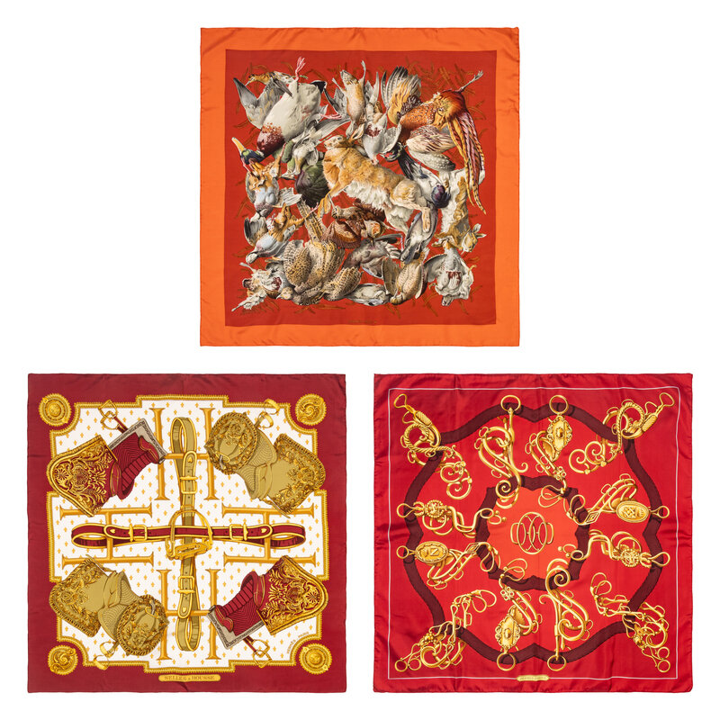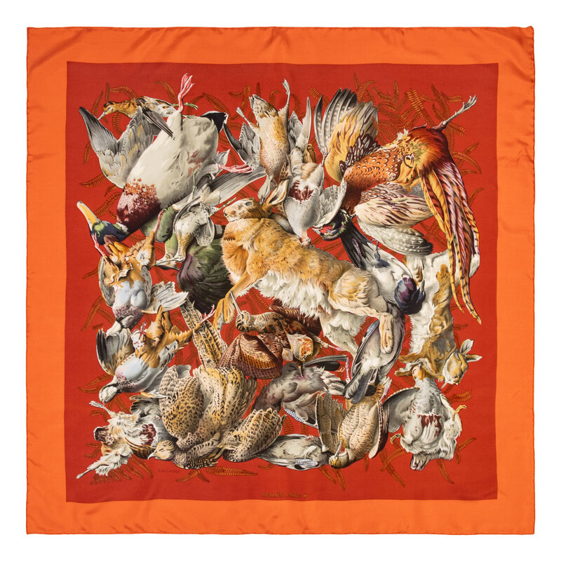 "Gibiers" Scarf 90 in printed silk twill. Features rolled and hand-stitched edges.