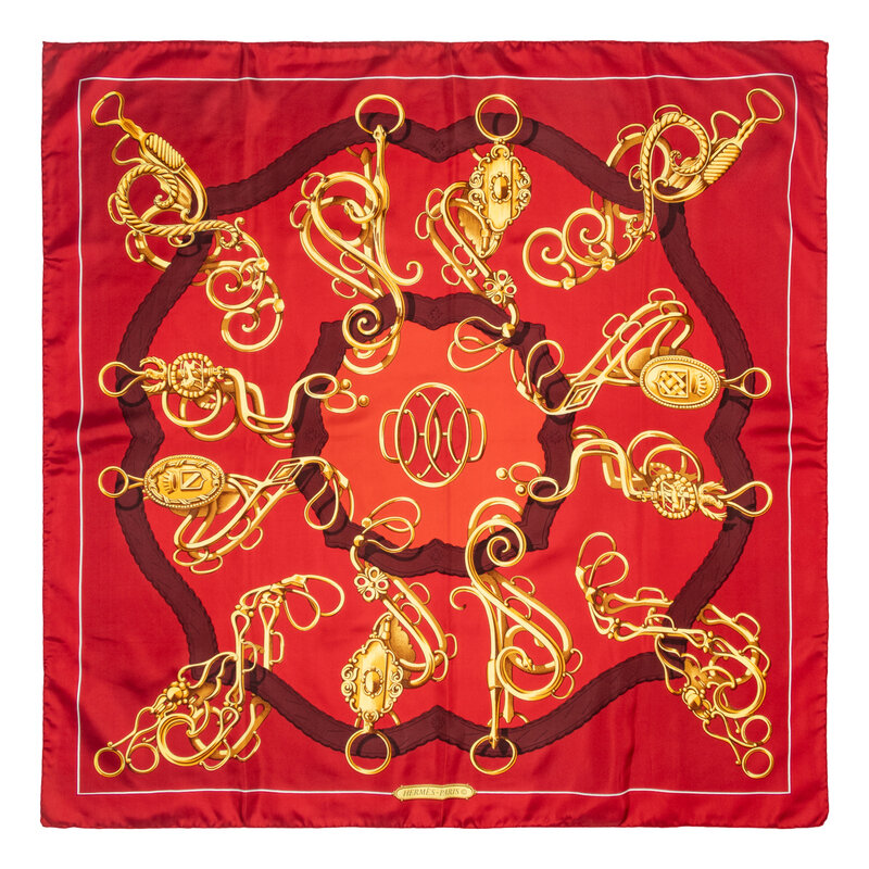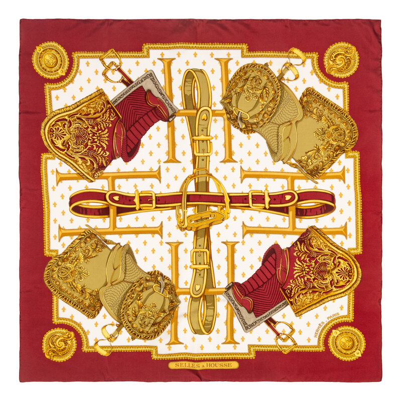 "Selles à Housse" Scarf 90 in printed silk twill. Features rolled and hand-stitched edges.