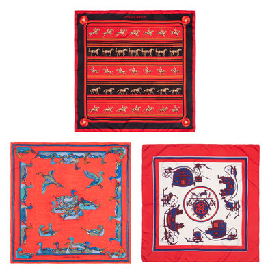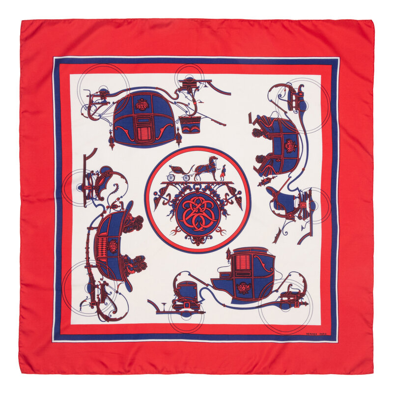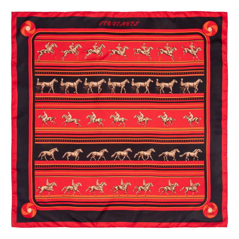 "Séquences" Scarf 90 in printed silk twill. Features rolled and hand-stitched edges.
