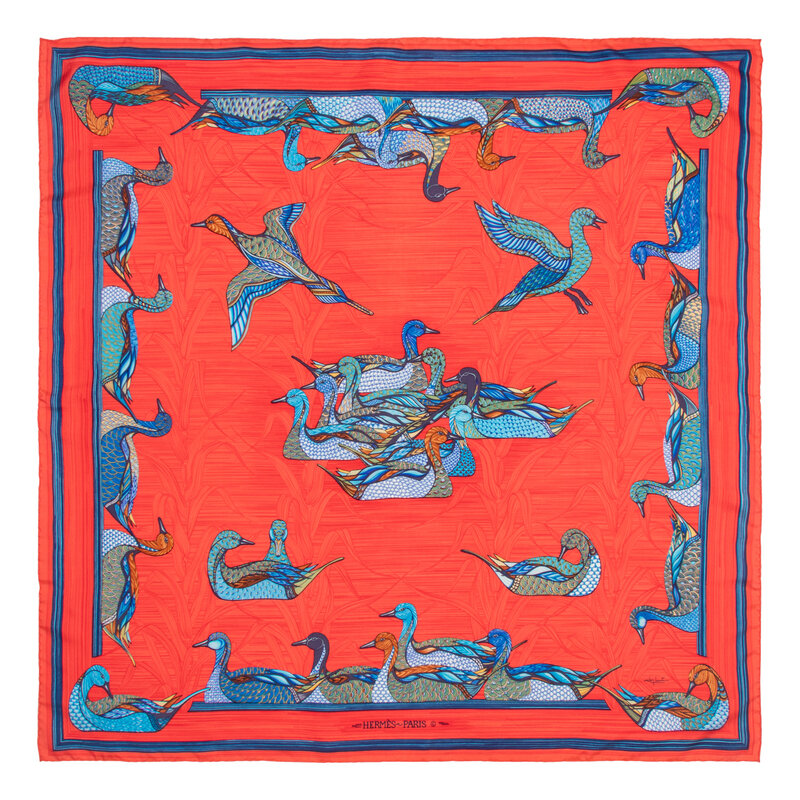 "La Mare aux Canards" Scarf 90 in printed silk twill. Features rolled and hand-stitched edges.