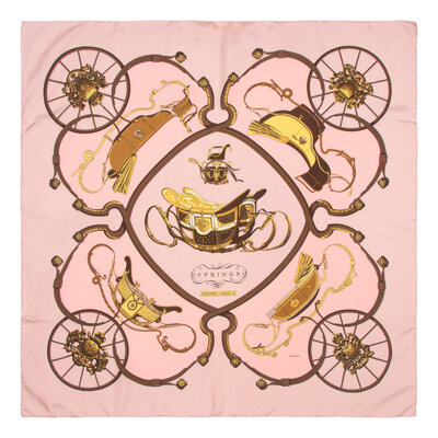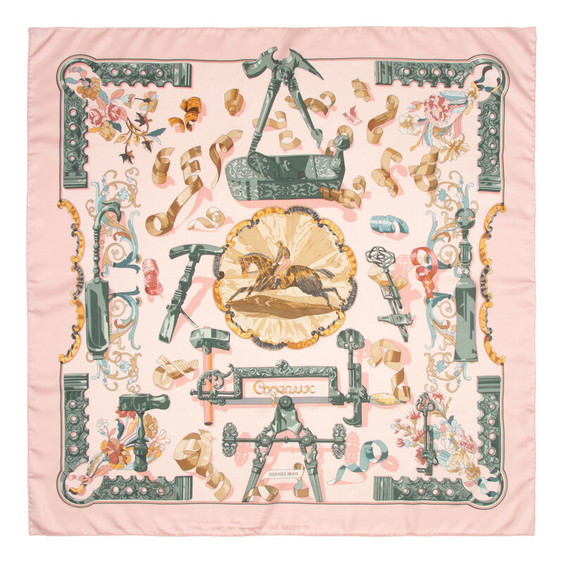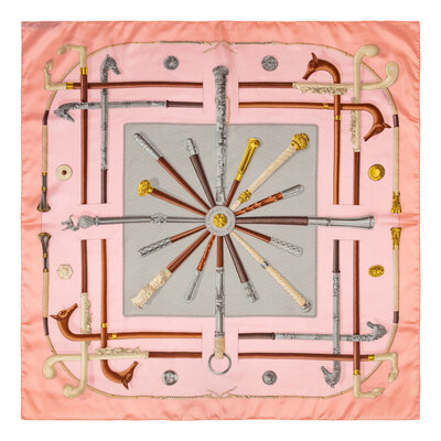 "Cannes et Pommeaux" Scarf 90 in printed silk twill. Features rolled and hand-stitched edges.